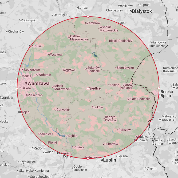 - Województwo lubelskie: Biała Podlaska, Łuków, Międzyrzec Podlaski, Radzyń Podlaski, Parczew oraz przyległe tereny.